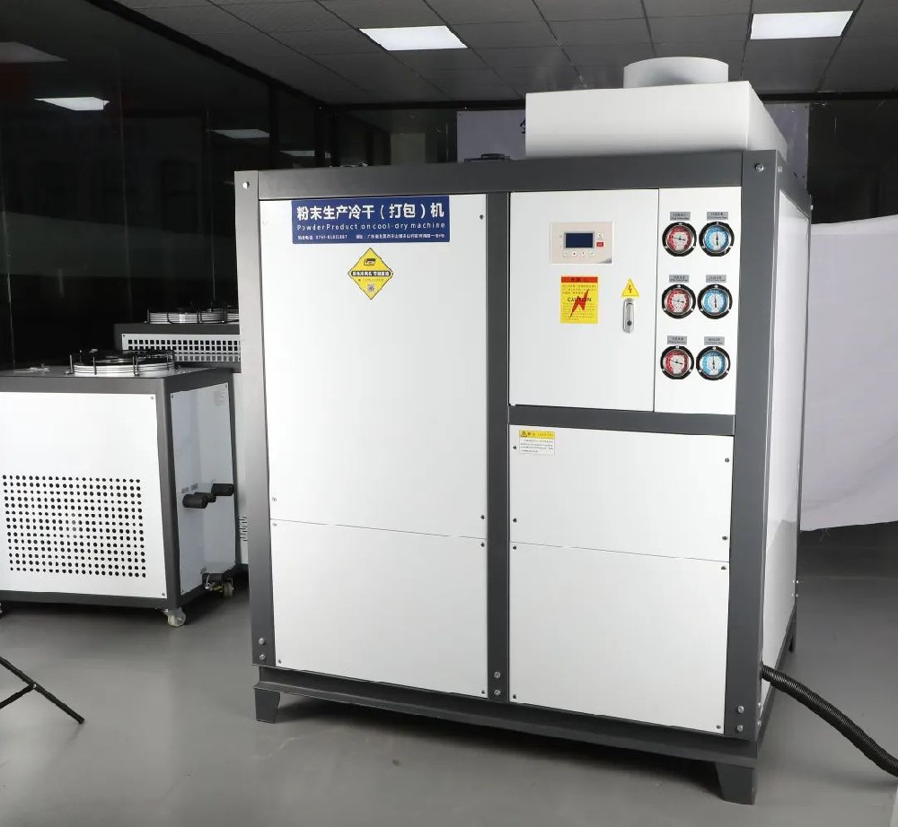 乐畅研发的这款粉末冷干机主要是针对粉末厂。因为粉末在打包过程中会产生结团的现象,需要冷风机吹冷风来解决结团,提升打包效率。它的制冷原理是通过吸干净的自然风进入机器内容,通过压缩机制冷,将冷风机吹到客户所需的环节上。
